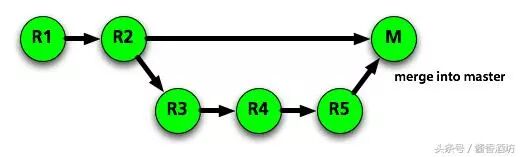 merge命令把不同的分支合并起来。如上图,在实际开放中,我们可能从master分支中切出一个分支,然后进行开发完成需求,中间经过R3,R4,R5的commit记录,最后开发完成需要合入master中,这便用到了merge。