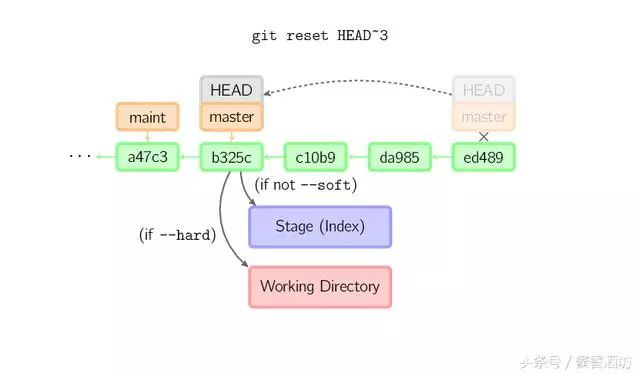 | git reset —soft <commit> | 只改变提交点,暂存区和工作目录的内容都不改变 |