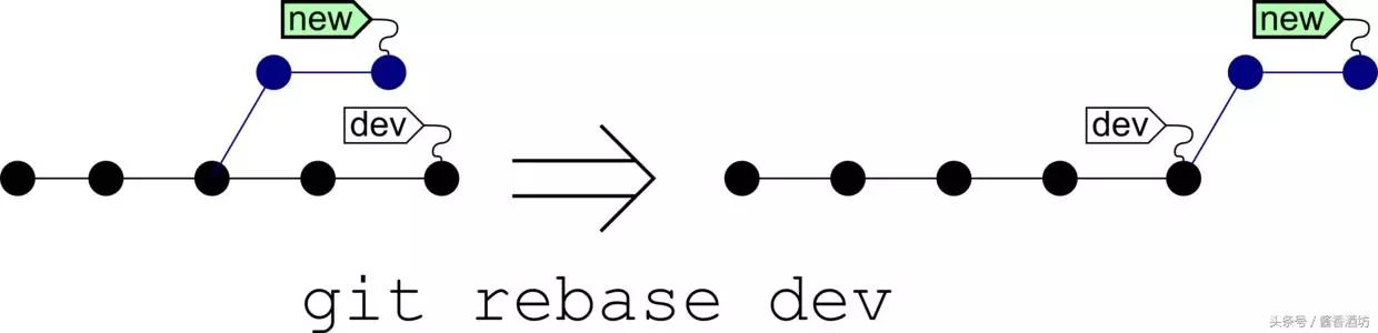 在开始阶段,我们处于new分支上,执行git rebase dev,那么new分支上新的commit都在master分支上重演一遍,最后checkout切换回到new分支。这一点与merge是一样的,合并前后所处的分支并没有改变。 git rebase dev,通俗的解释就是new分支想站在dev的肩膀上继续下去。rebase也需要手动解决冲突。