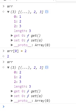 }然后在控制台中分别输入arr、arr[0] = 2、arr,可以看到如下图的结果。