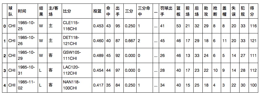 Index(['球队', '时间', '结果', '主/客场', '比分', '投篮', '命中', '出手', '三分', '三分命中', '三分出手',