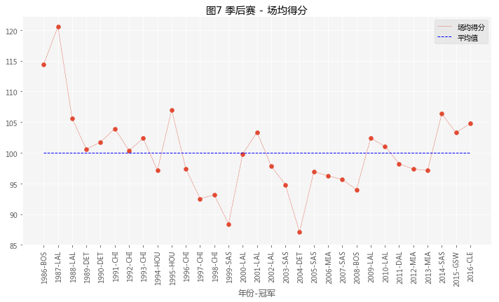 - 在这31次冠军归属中,季后赛场均得分100以上和100以下的冠军比例接近1:1(实际为16:15)