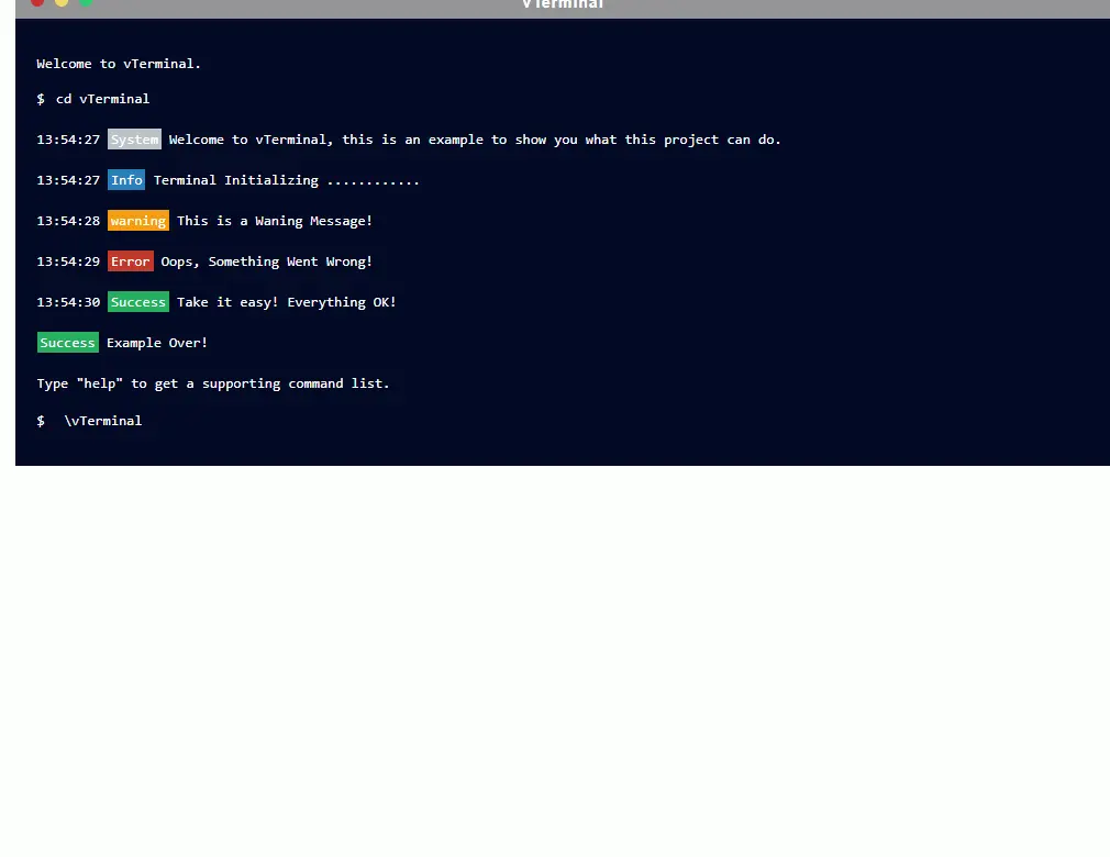 commandList 中的核心是messages数组,数组内是多个message对象,执行command时,会将command中的message显示在Terminal窗口中,比较简单,不多说,一个示例就解决了:
