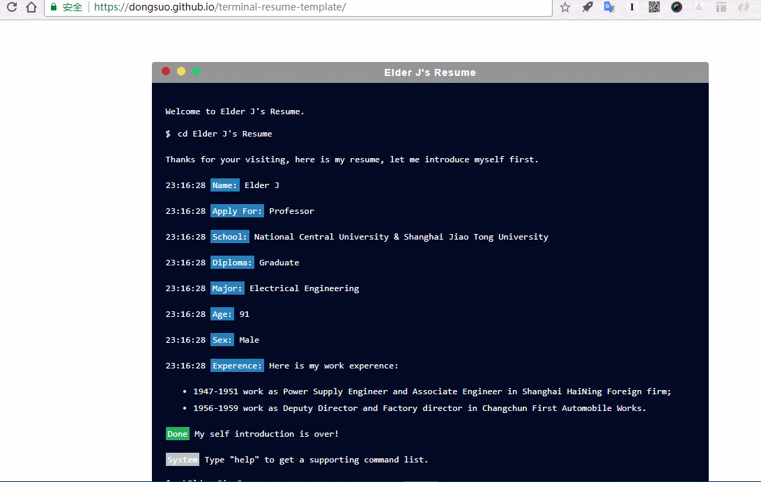 上图就是一个用vuejs在浏览器中模拟出来的终端界面,用这个来做一份简历还是有点小酷吧?(在线体验:dongsuo.github.io/terminal-re…,源码:github.com/dongsuo/vue…)