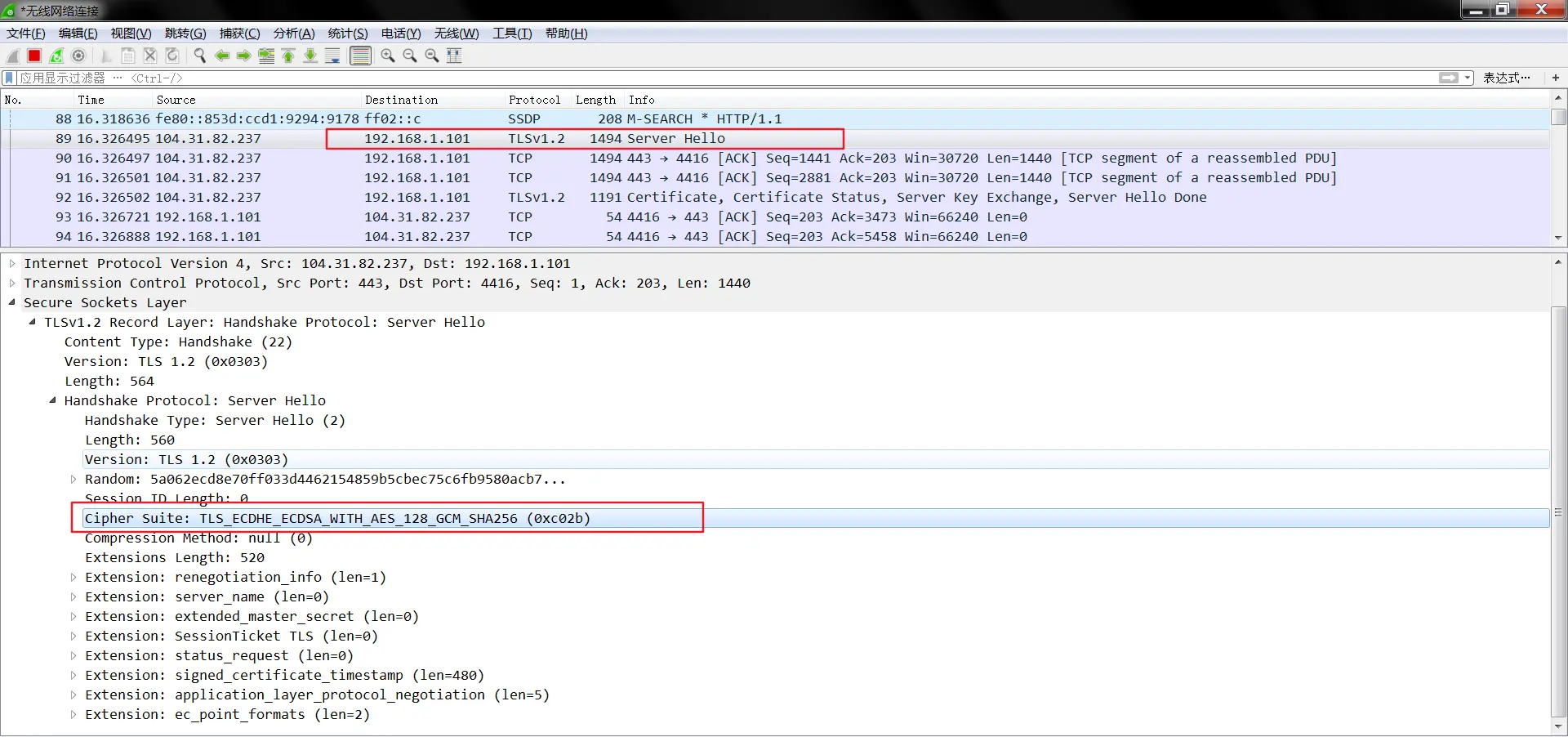 - 如果按照顺序继续寻找第一个 Info 为'Sever Hello' 的报文,可以找到相应的Cipher Suite: TLS_ECDHE_ECDSA_WITH_AES_128_GCM_SHA256 (0xc02b) 。