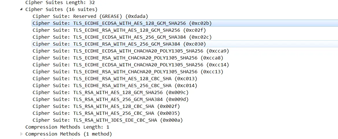 - 可以看到, Cipher有很多。总共16,第一个是Cipher Suite: TLS_ECDHE_ECDSA_WITH_AES_128_GCM_SHA256 (0xc02b)。