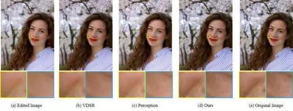 (优图算法与其他模型复原效果对比图,第四组为优图,第五组为原图)
