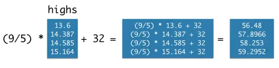数组可以用在算术表达式中来计算其内容。 当数组与单个数组合时,该数与数组的每个元素组合。 因此,我们可以通过编写熟悉的转换公式,将所有这些温度转换成华氏温度。