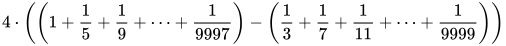 虽然需要一些数学来确定它,但我们可以用数组来说服我们自己,公式是有效的。 让我们计算莱布尼茨的无穷和的前 5000 个项,看它是否接近 π。