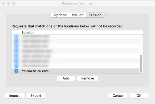 太多的请求眼花缭乱,看不到自己想看到的请求?那么使用Include吧。只要你在这里配置了请求,那么charles将只拦截匹配的请求,还可以使用正则匹配,例如图片中,只拦截域名以"baidu.com"结束的域名,www.baidu.com、news.baidu.com以及zhidao.baidu.com都可以拦截到,但是不想看到的例如www.taobao.com就看不到了