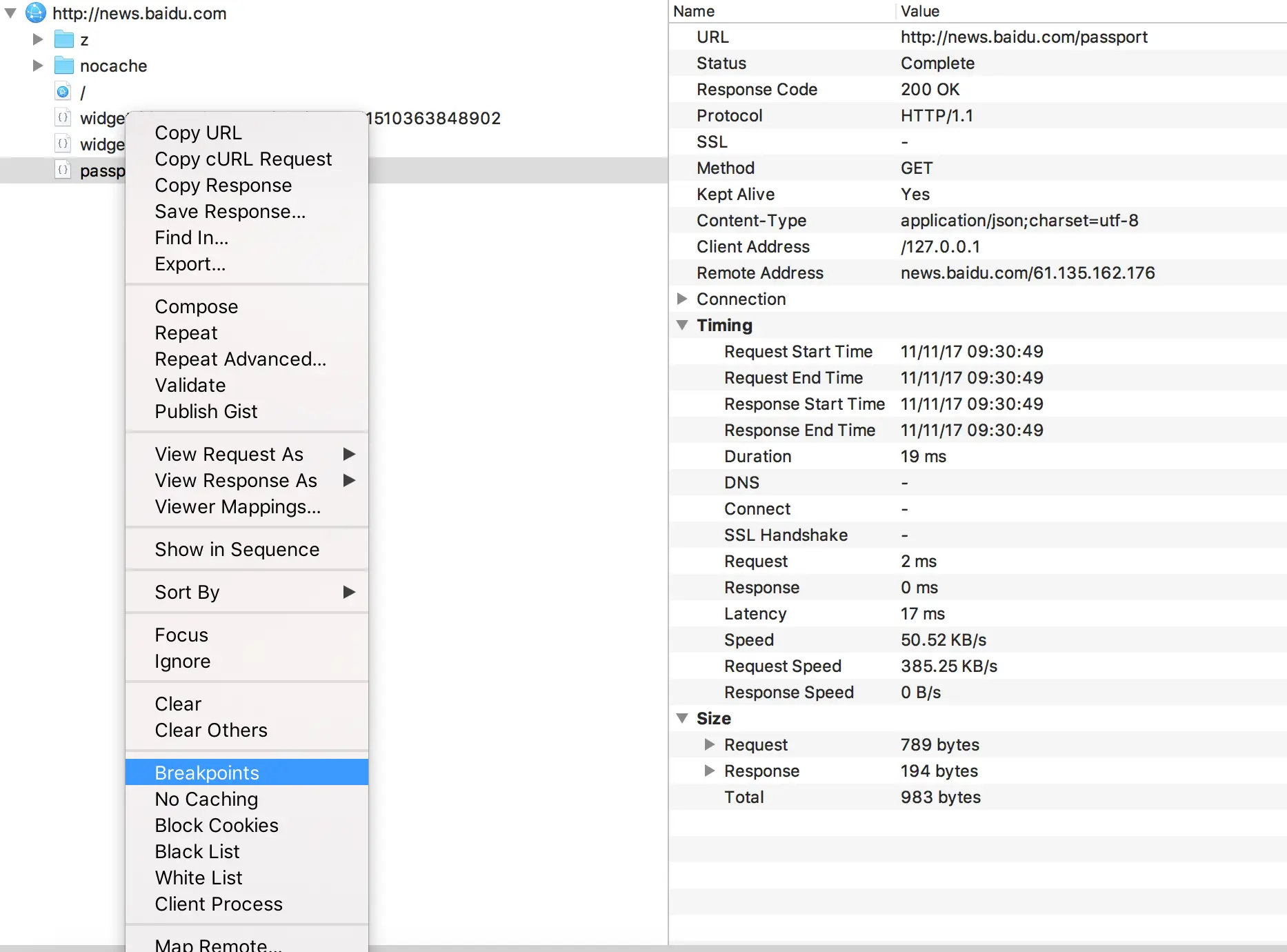 注:此处右键之后有很多的功能待发掘,例如repeat会重复发送这个请求,或者此处有Map Remote可以直接进入界面设置要把这个路径匹配至哪里等等