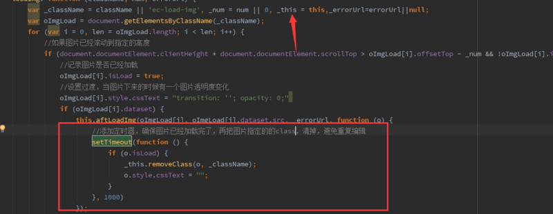还有一个常用的场景是,当使用了setTimeout或者setInterval的时候。如下‘图片懒加载的实例’(代码暂时可以不用看得太细,看图片就好,贴代码是为了让大家看到整个函数,不让大家蒙)。过程不详细说,看es6和es5的使用区别!