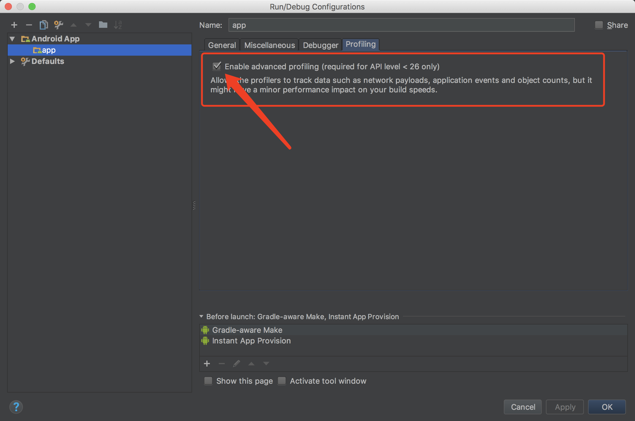 Profiling选项卡,然后选中Enable advanced profiling.。