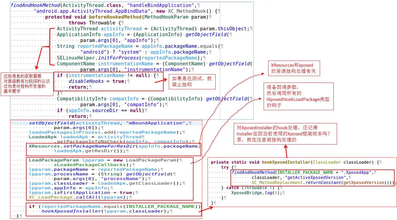 前面说过,在APP生命周期内,handleBindApplication是APP刚准备好相关信息的一个重要点,在这个点去进行挂钩处理简直是最好不过了。当然,此处的挂钩处理也就是准备好这个APP的相关信息然后调用所有的IXposedHookLoadPackage类型的钩子。