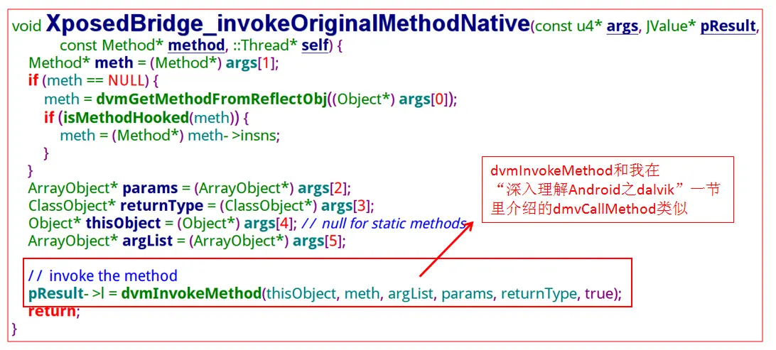 注意喔,我们现在已经在处理被挂钩函数的调用了喔....从JNI会进入到java层的钩子函数dispatch总入口,及handleHookedMethod,这个函数比较复杂,我们一段一段来看它。