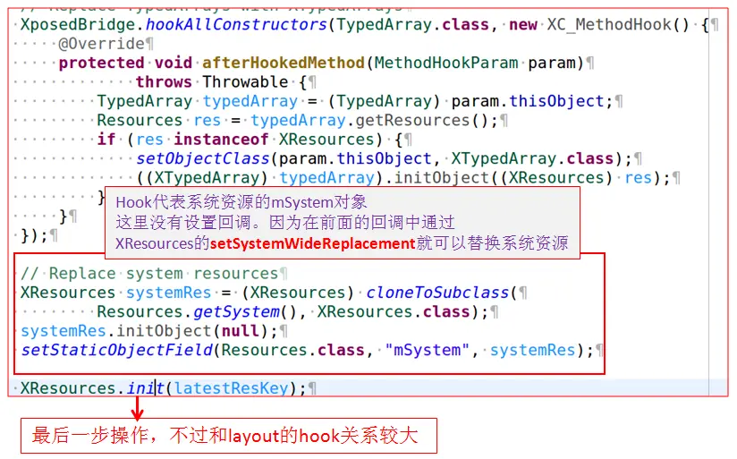上面替换的还是APP自己的资源,除此之外,Xposed还能替换系统资源(即framework-res.apk里声明的资源),这部分代码也在hookResources里,来看图37: