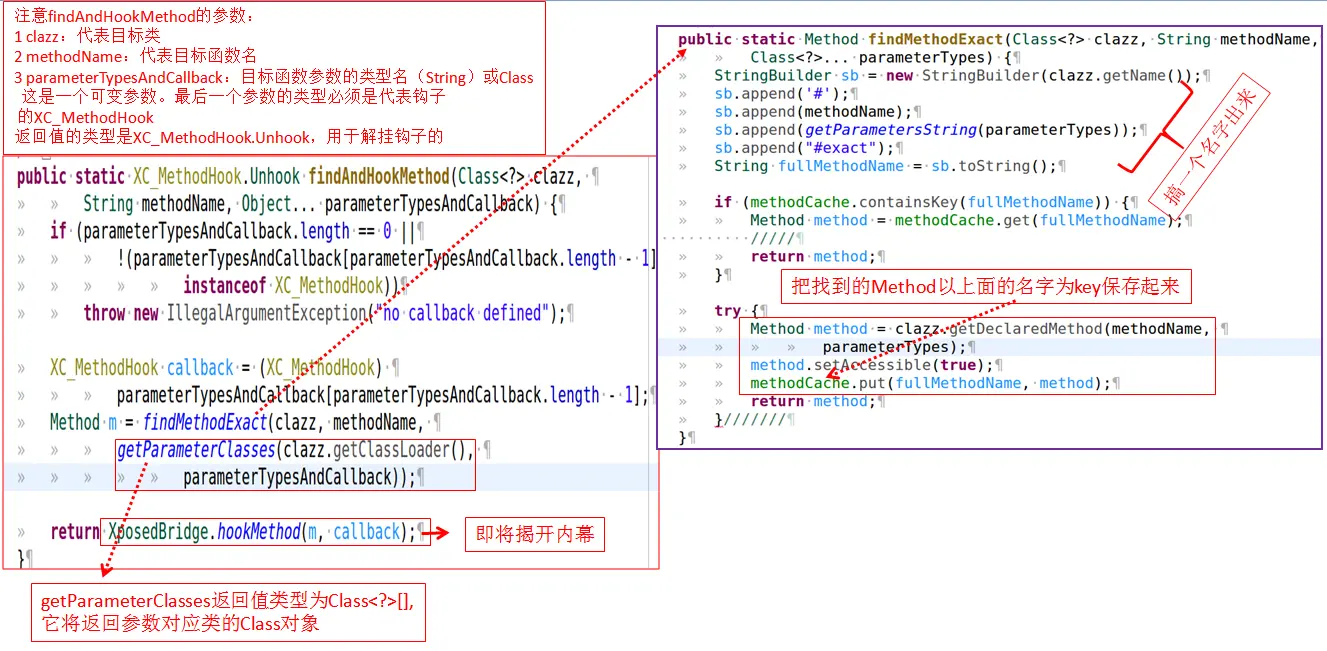 - 首先是通过class相关的函数找到指定的函数对象。这里的查找需要指定函数所在的类,函数名,函数参数信息等,属于精确(exact)查找。注意,findAndHookMethod函数的最后一个参数必须是XC_MethodHook类型,即钩子对象的数据类型。