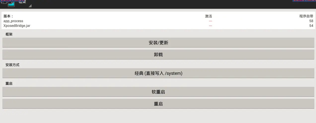 注意,图6右上角的“程序自带”两个版本号,分别是app_process版本号为58,XposedBridge.jar版本号是54.