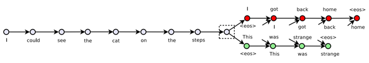 这三句话的顺序是,I got back home. I could see the cat on the steps. This was strange.从训练的文本中取出类似这样的连续的三个句子,将中间的句子作为输入,前一个和后一个句子作为正确的输出来训练模型。模型使用的是encoder-decoder框架,并且用了RNN中的GRU来作为encoder和decoder。