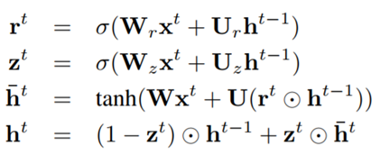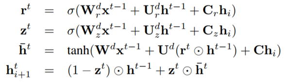 Encoder的输入是第i个句子中单词的向量序列 ,GRU的重置门、遗忘门、候选隐藏层和隐藏层的公式如下:
