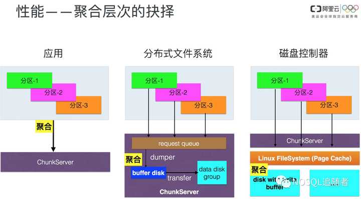 如上图所示,就是聚合时机选择的问题。BigTable和HBase的核心思想是聚合以减少IOPS,从而提高性能;那么聚合是否一定要做在table server这一层做呢?是否可以下推做到分布式文件系统层?结论是当然可以,而且效果更好,受益方更多。具体架构见附件里面的说明,我们通过将聚合下推到文件系统、RPC层小包聚合、Pipeline传输等大幅改进了性能,在可用性和性能之间取得了很好的平衡。当然,随着硬件的演进,未来可能磁盘控制器就把聚合做好了,上面的应用都不需要关心,这样受益方就更多了。