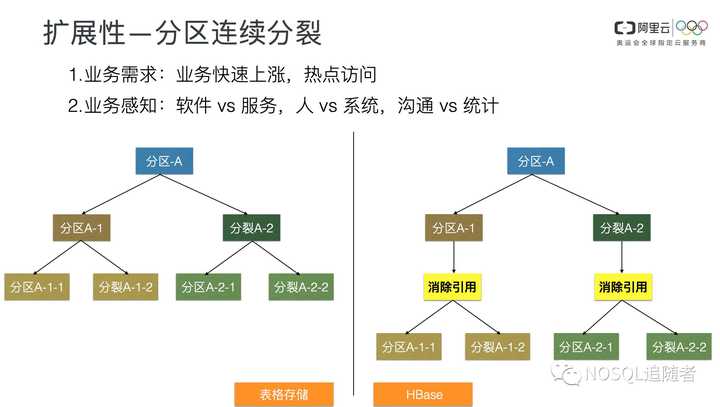 熟悉HBase的同学知道,HBase在一次分裂之后,需要做Compaction才能继续分裂,而Compaction时间持续可能数个小时,也就意味着数个小时内无法进一步分裂从而分担读写压力。表格存储支持连续分裂,也就是1个分区分裂成2个后,可以立刻继续分裂。那么,为什么表格存储要支持连续分裂呢?主要原因在于公有云多租户服务和企业内自用产品的不同。对于表格存储而言,用户点点鼠标就可以开通,业务访问随时可能大幅上涨,用户不会提前告诉我们,即使告诉了我们也没那么多人随时响应。而访问量上涨有很大的可能导致分区内访问热点,这些热点会导致延时上涨或者访问错误,需要系统能够快速的处理,否则就要赔钱。这时候系统必须具备连续分裂的能力,1个分裂成2个,2个分裂成4个... 。HBase更多的是作为一个软件,在企业内部由专门的DBA独立运维。而在企业内部,业务一般可以预期,很难出现运维不期望的巨量上升,所以对于HBase而言,连续分裂的必要性就降低了。这个不同,看似技术的不同,实际则是用户不同、产品形态不同带来的的不同选择。