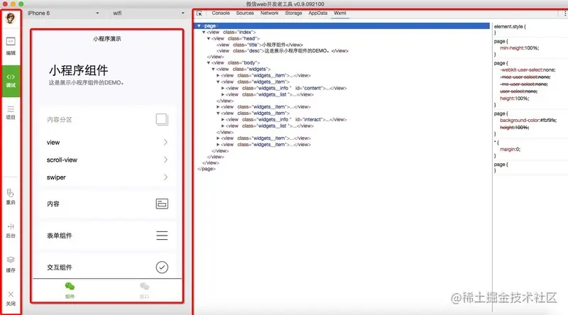 从整个结构布局来看这款IDE工具可以分为三个部分,首先左侧为导航操作区域,中间是目录或展示区域,右侧为调试区域(很像Chrome的调试工具)。下面我就以前端的角度分别从代码角度和宏观角度介绍下自己对于微信小程序的看法。