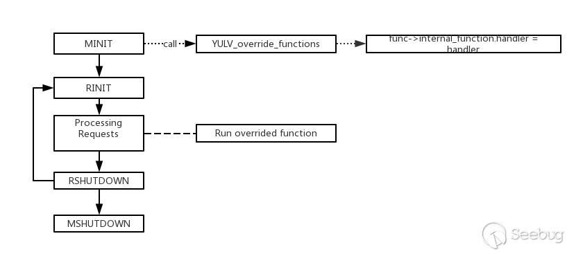 在PHP实例启动时,PHP解释器会依次加载每个PHP扩展模块,调用每个扩展模块的MINIT函数,初始化该模块。当HTTP请求来临时,PHP解释器会调用每个扩展模块的RINIT函数,请求处理完毕时,PHP会启动回收程序,倒序调用各个模块的RSHUTDOWN方法,一个HTTP请求处理就此完成。由于PHP解释器运行的方式不同,RINIT-RSHUTDOWN这个过程重复的次数也不同。当PHP解释器运行结束时,PHP调用每个MSHUTDOWN函数,结束生命周期。