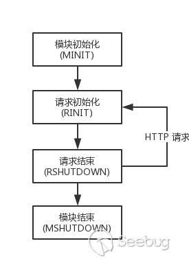 虽然PHP运行模式各不相同,但是,PHP的任何扩展模块,都会依次执行模块初始化(MINIT)、请求初始化(RINIT)、请求结束(RSHUTDOWN)、模块结束(MSHUTDOWN)四个过程。如下图所示: