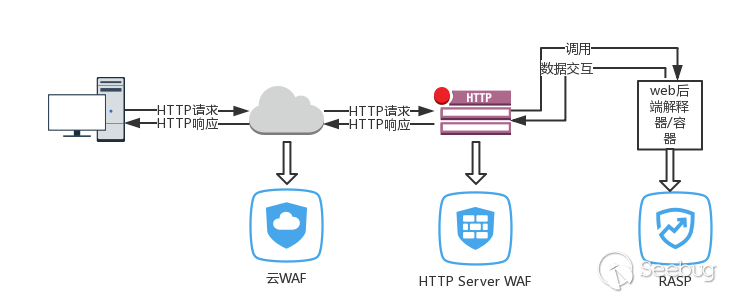 - RASP工作在Web后端解释器/编译器中,在漏洞代码执行前阻断执行流。