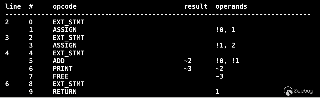 PHP核心由两部分组成,一部分是PHP core,主要负责请求管理,文件和网络操作,另一部分是Zend引擎,Zend引擎负责编译和执行,以及内存资源的分配。Zend引擎将PHP源代码进行词法分析和语法分析之后,生成抽象语法树,然后编译成Zend字节码,即Zend opcode。即PHP源码->AST->opcode。opcode就是Zend虚拟机中的指令。使用VLD扩展可以看到Zend opcode,这个扩展读者应该比较熟悉了。下面代码的opcode如图所示