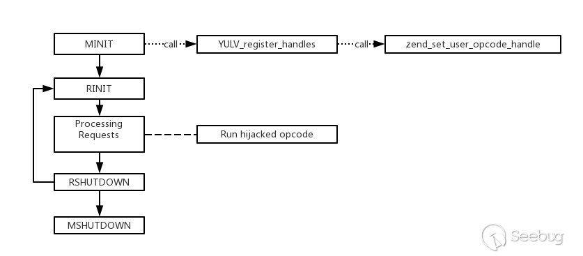当被污染的变量作为参数被传入关键函数时,触发关键函数的安全检查代码,这里的实现其实跟上面的类似。PHP的中函数调用都是由三个Zend opcode:ZEND_DO_FCALL,ZEND_DO_ICALL 和 ZEND_DO_FCALL_BY_NAME中某一个opcode来进行的。每个函数的调用都会运行这三个 opcode 中的一个。通过劫持三个 opcode来hook函数调用,就能获取调用的函数和参数。这里我们只需要hook opcode,就是上面第二幅图示意的部分,为了让读者更加清晰,我把它复制下来。