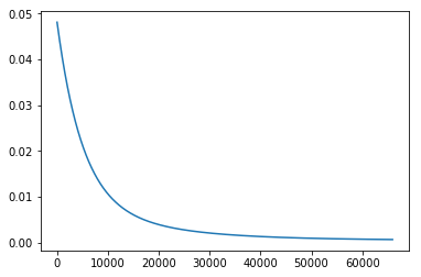 结果显示经过,OLS梯度下降经过如下时间得到初步收敛,OLS convergence duration: 7.456927 s,经过3万多个时步迭代,每个时步计算代价函数的取值,如下图所示: