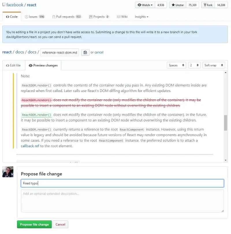 当你在 GitHub 查看文件时(任何文本文件,任何仓库中),右上角会有一个小铅笔图标,点击它就可以编辑文件了。完成之后点击 Propose file change 按钮 GitHub 将会自动帮你 fork 该项目并且创建一个 pull request 。