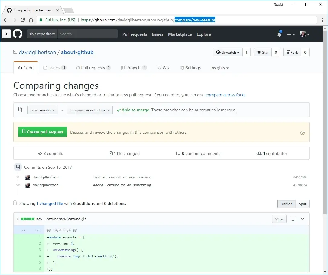 以上就是和 master 分支的差异,如果想要合并分支的话,只需要输入 /compare/integration-branch...my-branch 即可。