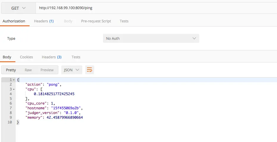 kofcno637cmq judge_swarm replicated 3/3 registry.cn-qingdao.aliyuncs.com/marklux/judge_server:1.0 *:8090->8090/tcp现在我们尝试在本地访问192.168.99.100:8090/ping,就可以得到响应了,事实上,现在无论将ip换为worker1或者worker2的,响应的结果都是一样,因为此时所有节点已经处在一个共同的集群网络下了