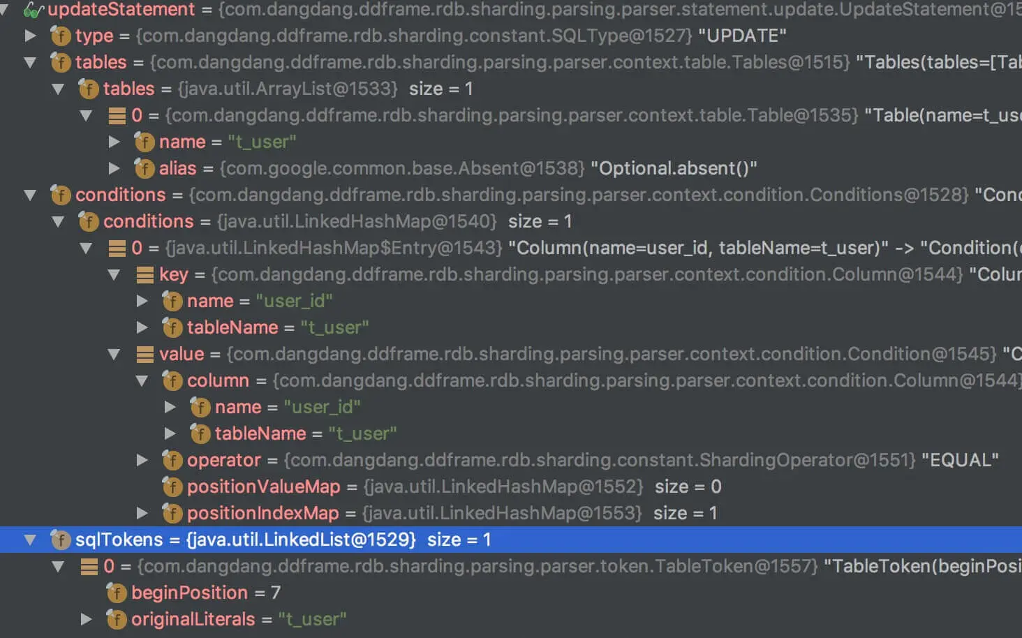 我们来看下 UPDATE t_user SET nickname = ?, age = ? WHERE user_id = ? 的解析结果: