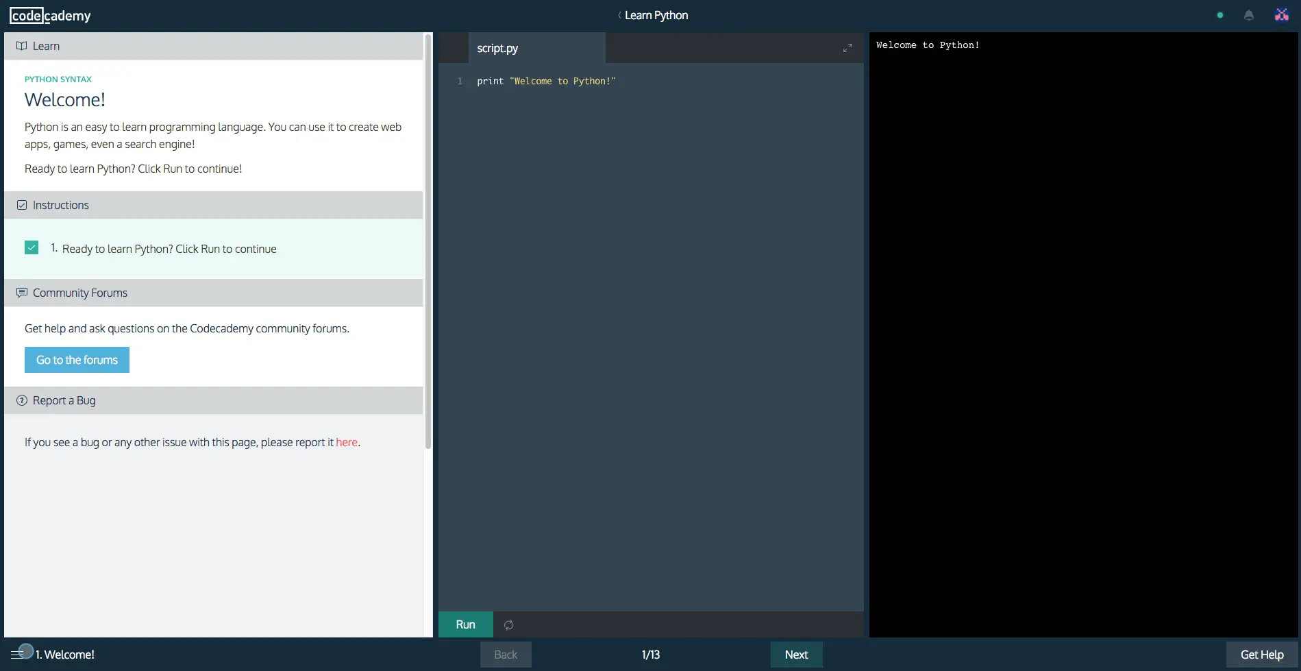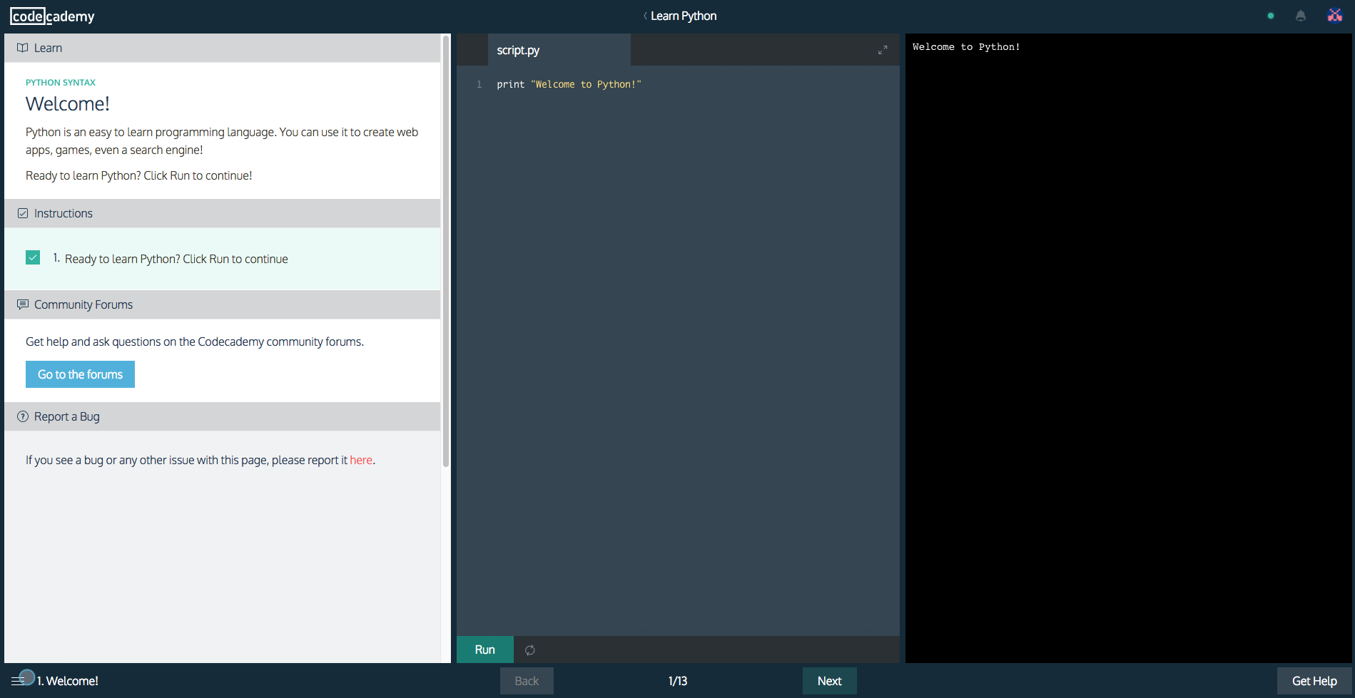 第二个是**「Codecademy」**这个网站,这个网站上面有很多语言的入门教程,它是一种引导式的教学方式,不仅有文档,而且可以在线的进行编译和运行,可以说是手把手了,质量很高。不过有一点尴尬的是,可能大部分的教程是英文,不过好在教程本身不复杂,抠一抠还是能看懂的,它的界面是这样的: