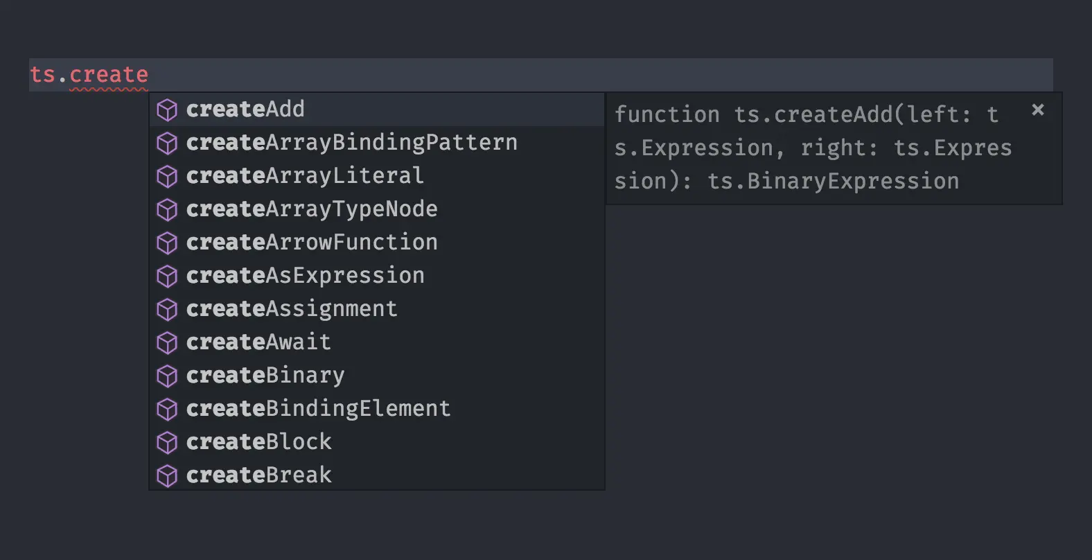 TS 中 AST 节点的工厂函数全都以 create 开头,在编辑器里敲下:ts.create,代码补全列表里就能看到很多很多和节点创建有关的方法: