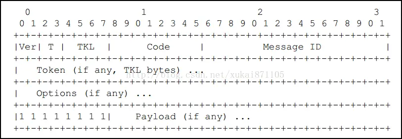 CoAP消息结构 一个CoAP消息最小为4个字节,以下是CoAP协议不同部分的描述。 【版本Version】:类似于IPv6和IPv6,仅仅是一个版本号。 【消息类型Message Type】:CON,NON,ACK,RST。 【消息ID Message ID】:每个CoAP消息都有一个ID,在一次会话中ID总是保持不变。但在这个会话之后该ID会被回收利用。 【标记 Token】:标记是ID的另一种表现。 【选项 Options】:CoAP选项类似于HTTP请求头,它包括CoAP消息本身,例如CoAP端口号,CoAP主机和CoAP查询字符串等。 【负载Payload】:真正有用的被交互的数据。