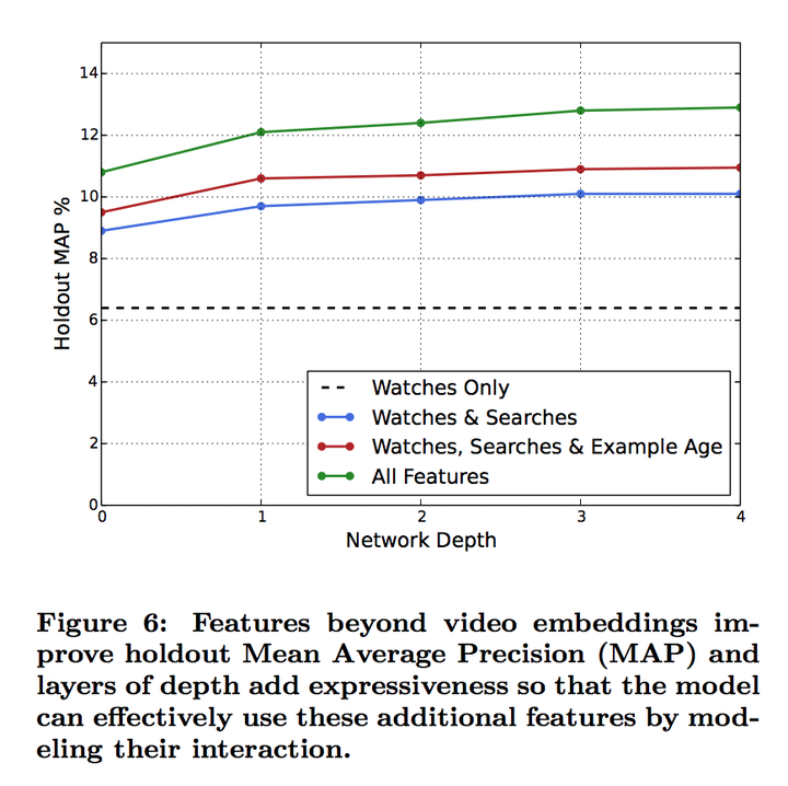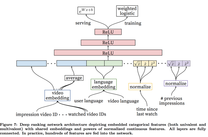 在数据源上面,YouTube也做了不少思考。推荐算法的label是从所有视频播放来的,而不只是被推荐的视频播放来的,以确保如果用户有其他途径导致某一个视频火了,推荐算法能够很快地获得这个信息。还有,推荐算法是不知道这个视频是从哪里搜索来到,否则的话主页推荐会跟用户刚刚结束的搜索关系过度紧密。最后,YouTube每次计算的概率是未来会观看的概率,而不是hold-out的视频被观看的概率。这个问题在视频推荐里面差别非常大,因为视频推荐数据里面本来就有很多的视频观看是有非常高的co-watch概率,比如电视剧和MV。(其实最后一点我不大理解为什么花费这么多地篇幅去解释。。。。)