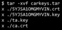 存储卡:其中一张存储卡上有一个名叫carkeys.tar的文件,其中包含了这辆Model S的OpenVPN认证信息,也就是一个X509标准证书、一个RSA私钥和一个OpenVPN静态密钥,这些相当于车钥匙,所以未来汽车的钥匙可能都是基于密码算法的,如图6所示。