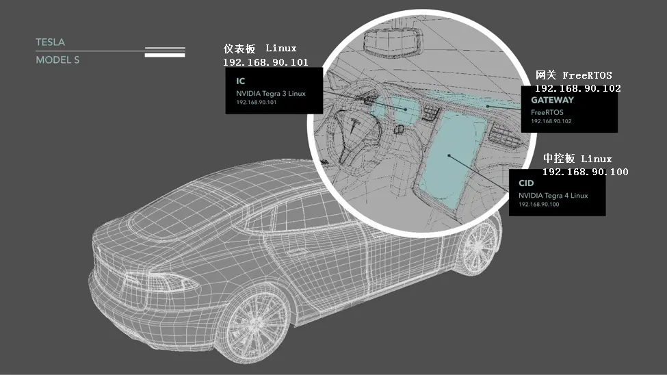首先来看看Model S信息娱乐系统的几个模块,分别是仪表板、中央信息显示和网关,其中仪表板和中央信息显示两个模块都运行版本比较老的Ubuntu操作系统,网关运行开源的实时操作系统FreeRTOS。