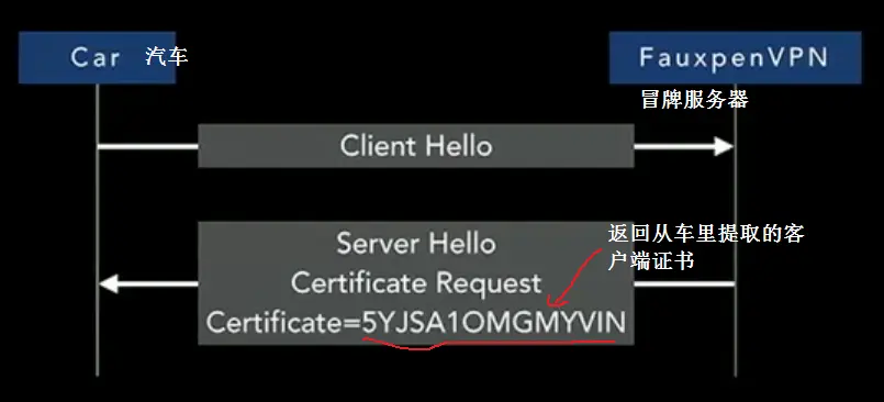 特斯拉有一个根证书认证机构(root CA),根证书机构下面链接了一个Policy CA(策略证书认证机构,这个机构自己的证书由root CA签发),然后Policy CA还签发了一个Issuing CA(签发CA),最后这个CA被用于签发服务器的证书和汽车的证书(汽车的证书是用于服务器验证汽车的),由于服务器和客户端都由同一个CA签发,如果对证书的认证只检查证书的签发CA就会出现安全问题。x509v3EKU(Extended Key Usage是个扩展标准,指定了公钥用途)中规定了一个证书中的公钥的用途,也就是说,一个证书只能被用于特定的目的,比如VPN服务器的证书就只能用于服务器认证,而CarKey的证书只能被用于客户端认证。OpenVPN中可以设定是否要对EKU中指定的密钥用途进行验证,所以我们的问题是万一特斯拉汽车配置OpenVPN时没有开启这个对公钥(比如CarKey.tar里包含的和VPN服务器传来的证书里包含的公钥)的用途验证呢?所以如果搞个假的服务器FauxpenVPN(记住我们说过要中间攻击),当这辆车和我们的冒牌FauxpenVPN通信时,它向FauxpenVPN发送hello,这时冒牌服务器就把汽车CarKey.tar里那个证书返回给车,如图9所示。