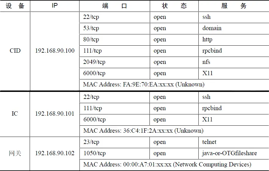 通过这个接口可以与汽车的娱乐信息系统网络通信,接入信息娱乐系统网络后使用Nmap等工具对内网扫描就可以发现3个设备,一个是CID、一个是IC、另一个是网关。这三个设备发送了大量(约1000个包每秒)的UDP广播包(目的地址192.168.90.255),根据数据类型的不同使用不同的端口,这就与CAN总线的机制非常类似,网络上每个节点将数据广播到网络上,需要数据的节点就接收需要的数据,猜测这里的端口号类似于CAN的消息ID。通过扫描还发现了一些开放的端口及对应的服务,如表1所示。