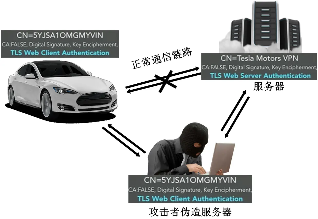 CarKey里的证书和真的VPN服务器的证书的认证链相同,如果特斯拉在配置OpenVPN服务时没有检查前面说的EKU证书用途(因为我们发给服务器的是从汽车中名为CarKey.tar的文件中提取出来的证书,而这个证书是用于客户端认证的证书),那么汽车会信任FauxpenVPN,就可以进行中间人攻击了,如图10所示。