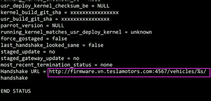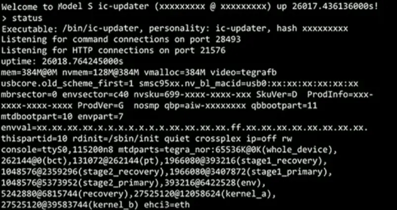 最后,他们还找到了分别运行于IC和CID上的两个程序ic-updater和cid-updater,从字面意思理解这两个程序分别为IC和CID的升级程序,功能是获取诊断信息、上传文件或者固件,这两个程序的大部分命令都有认证保护,但是其中也有些没有,例如‘status’,这两个程序在输入‘status’状态命令时会打印出许多信息娱乐系统的关键信息,属于信息泄露漏洞,图13所示为ic-updater status显示出的信息。