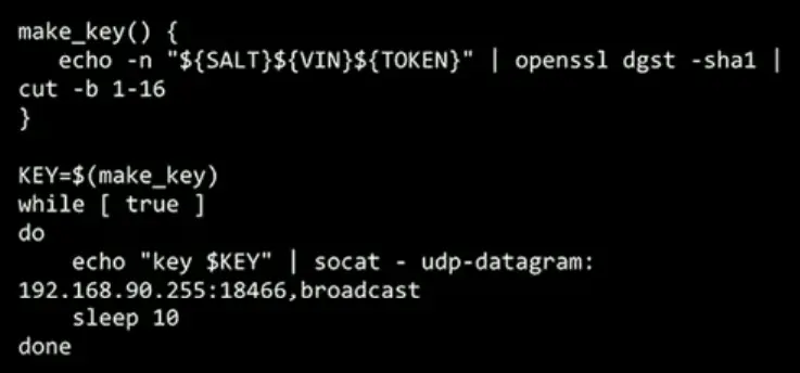 另外,前面提到的以太网结果被加入认证机制后其实认证也用到了这个token,网关(这里是指以太网接口与信息娱乐网络之间负责认证的“网关”)每隔30秒会对通过这个以太网接口对接入信息娱乐网络的设备进行认证,认证方式是由需要接入网络的设备根据token、VIN,以及一个salt计算一个哈希值以广播的方式发送出去,图16所示为自动认证代码。