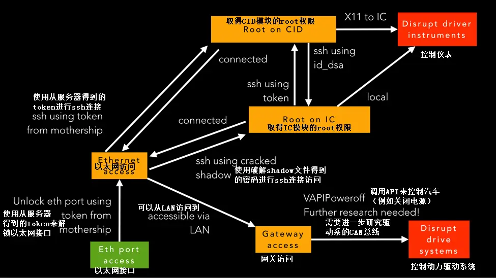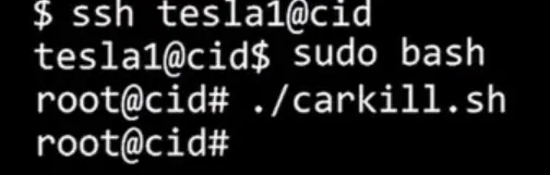 IC的root权限已经搞定了,下一步要搞定CID的root权限,由于没有CID的shadow文件,所以只有继续分析固件,通过分析固件发现CID每隔24小时就会从一个名为mothership的服务器获取一个安全令牌(Security Token),然后将一个名为tesla1的账号的密码设为这个安全令牌。CID还会将安全令牌发给IC,IC则将安全令牌明文存储。通过在IC的文件系统中找到这个安全令牌可以登录CID上的tesla1账号,而且这个tesla1账号也是一个sudoer,就这样,IC和CID的root权限都被搞定了。