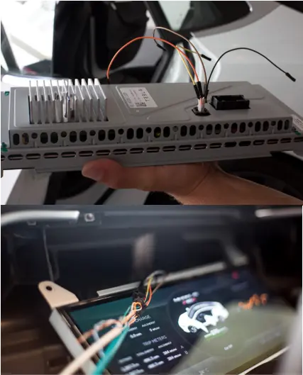 正当Marc Rogers进行研究时,其他研究人员找到了那个以太网接口,特斯拉通过远程升级将这个端口加入了认证机制,原本接上网线就可以与内网进行通信,现在却不行了,但是由于知道IC和CID都在内网上,所以可以通过直接将网线接到CID或者IC的以太网接口接入内网,如图14所示。